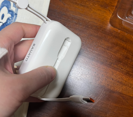 보조배터리를 사용하면서 가장 번거로운 점 중 하나가 충전 케이블을 따로 챙겨야 한다는 것이다. 바우아토 보조배터리는 케이블이 본체에 내장되어 있어, 추가 케이블을 챙길 필요가 없다. 아이폰 사용자라면 라이트닝 단자, 안드로이드 사용자라면 C타입 단자가 포함된 모델을 선택할 수 있다.