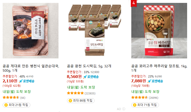소비자의 식생활에 밀접한 제품을 중심으로 구성되어 있으며, 로켓배송을 통해 신선한 상태 그대로 빠르게 받아볼 수 있다. 곰곰은 간편하고 건강한 먹거리를 찾는 고객들을 위한 브랜드로 자리잡고 있는 것 같다.