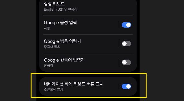 이 버튼을 켜고 끄는 것으로 키보드 하단 네비게이션 바에 있는 키보드-마이크 아이콘을 설정할 수 있다.