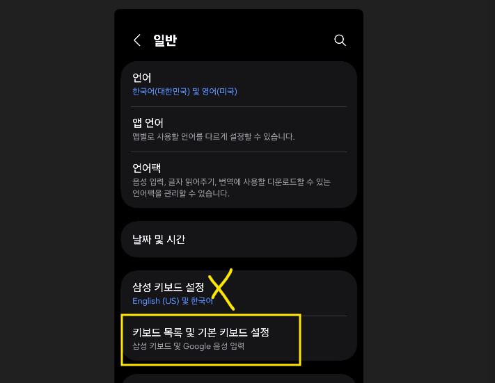 일반 설정 하위에 있는 키보드 목록 및 기본 키보드 설정으로 들어가야한다.