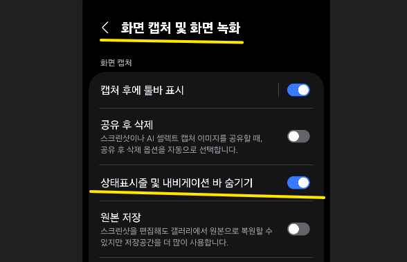 유용한기능-화면 캡쳐 및 화면 녹화-상태표시줄 및 내비게이션 바 숨기기 옵션