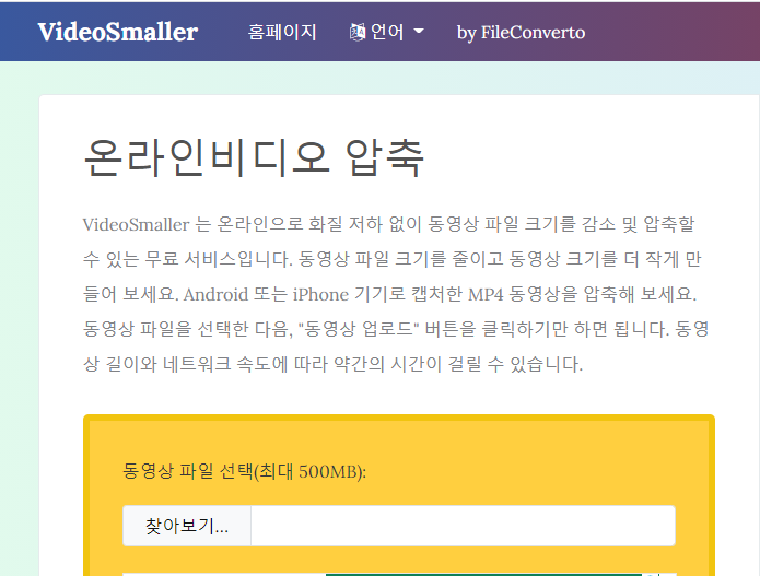 이 사이트인데요 이곳을 방문하셔서 동영상을 올리고 용량을 낮추시면 됩니다. 500MB라고 써있는 것 보이시죠? 온라인이기 때문에 너무 큰 용량은 어렵습니다.
