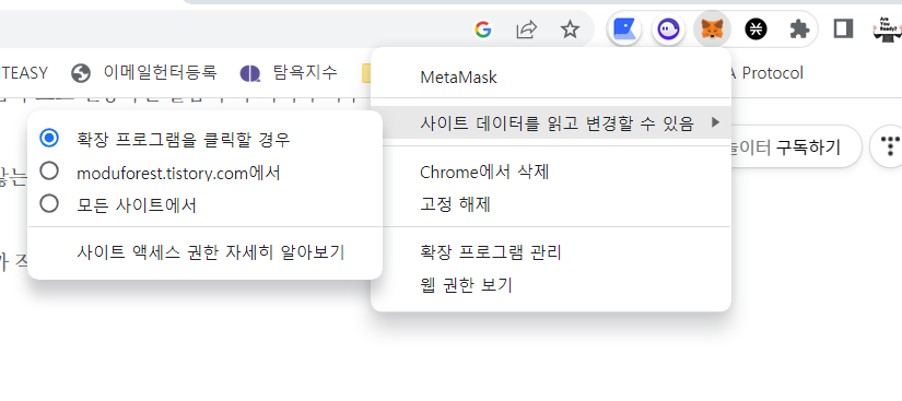 사이트에서 데이터를 읽고 변경할 수 있음 이라고 된 부분을 확장프로그램을 클릭할 경우 로 변경했다.