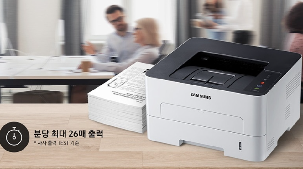 이 흑백 레이저 프린터의 인쇄 속도는 분당 최대 26매로, A4 기준으로 빠르게 문서를 출력합니다. 또한, 첫장 출력 시간은 단 8.5초 이하로 빠른 작업 시작이 가능합니다.