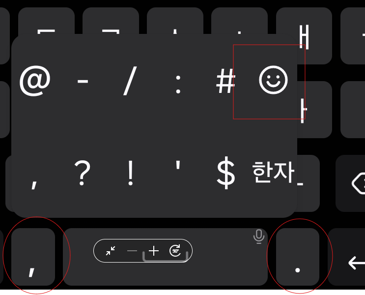 여기에 재밌는점이 있다. 삼성 키보드의 스페이스바 옆 두 위치는 원하는 문자나 기능으로 설정을 해둘 수 있다. 스페이스 옆의 버튼을 꾹 누르고 있으면 선택할 수 있는 옵션 버튼이 약 10개 가량 뜬다.
